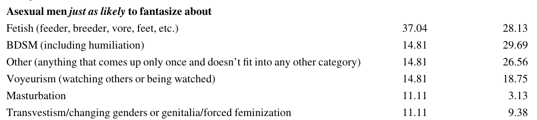 “Human asexuality is generally defined as a lack of sexual attraction… Of those who have had a sexual fantasy, asexual women and men were significantly more likely to endorse the response ‘my fantasies do not involve other people’ compared to sexual participants… Notably, both asexual and sexual participants (both men and women) were equally likely to fantasize about topics such as fetishes and BDSM.”